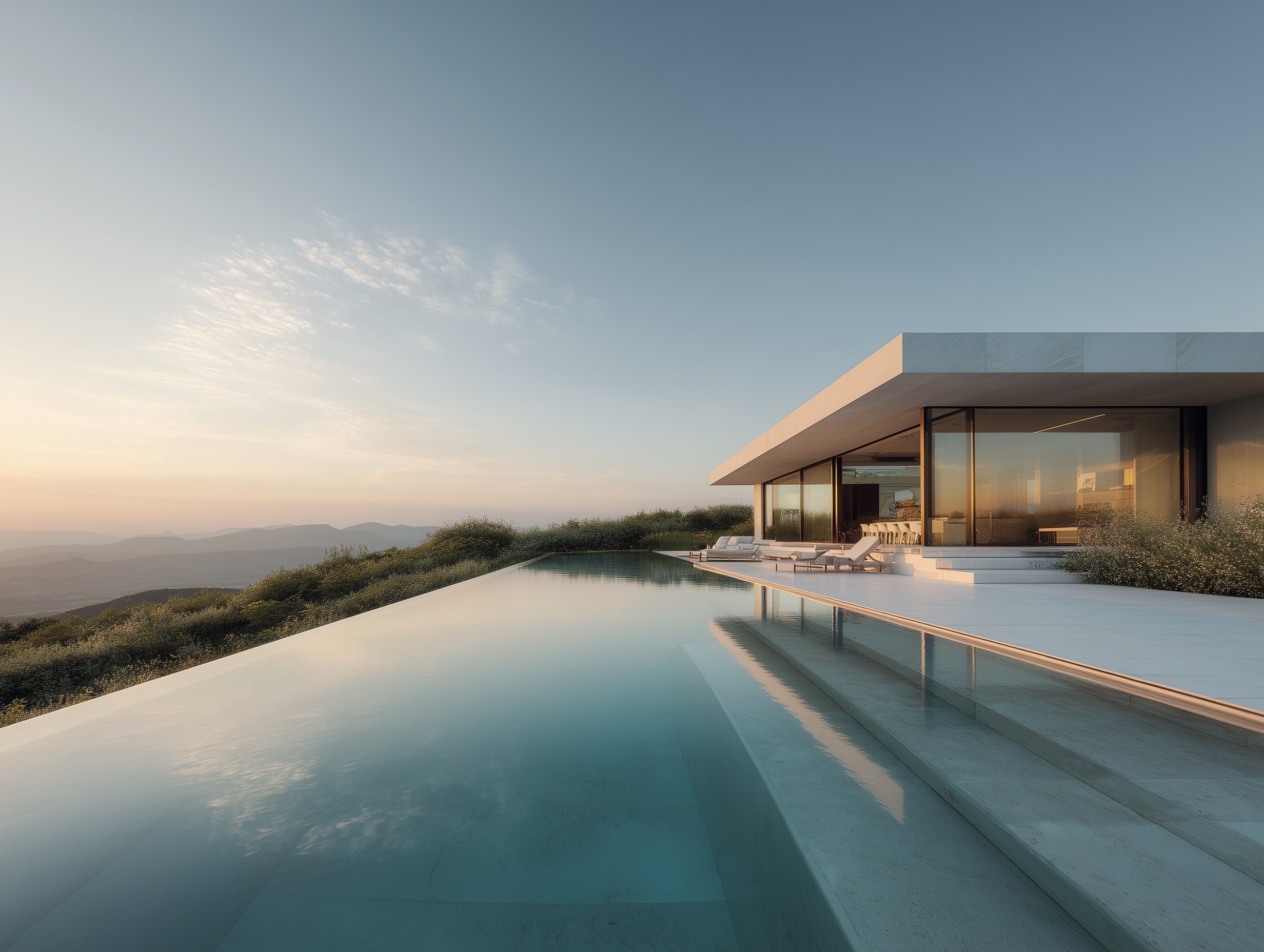 The private infinity pool stretches toward panoramic views, blending water and horizon into one continuous line. Designed for quiet mornings and golden-hour evenings.
